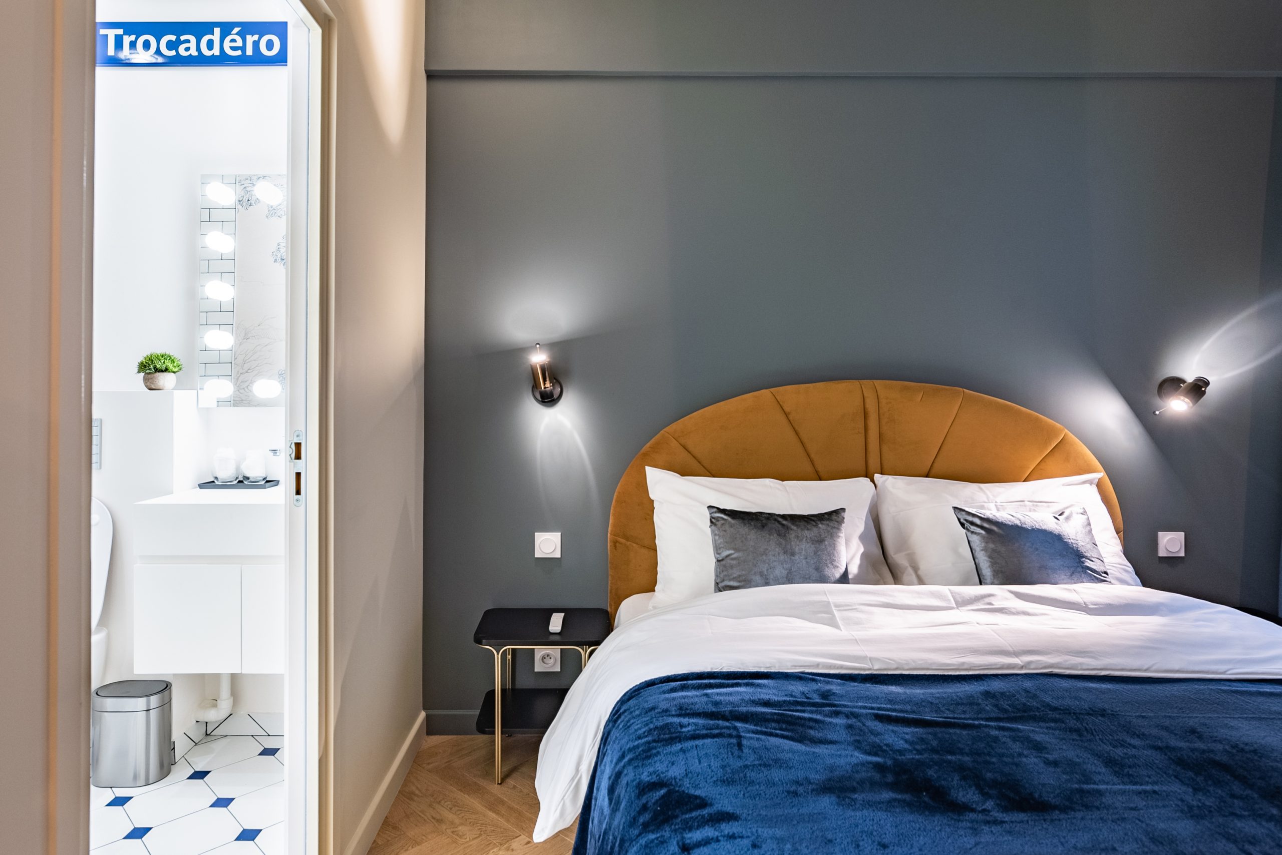 Vous êtes éblouis ! Eblouis par la finition, la sobriété des objets décos aux couleurs nobles ! Eblouis par le soleil pendant votre petit-déjeuner sur le balcon de la chambre ! Eblouis par cette vue sur les toits en ardoise des bâtiments haussmanniens dans le salon ! Eblouis par la « reproduction » de la station du Trocadéro dans la salle de bain ! Eblouis par la qualité des matériaux utilisés ! Vos premiers pas dans la location sont accompagnés par un seul mot : « WHAOUH !!! ».