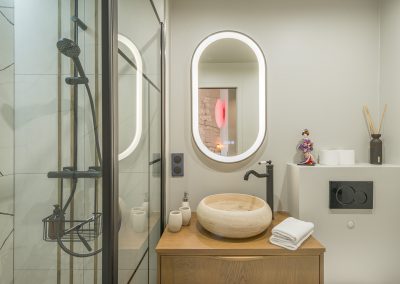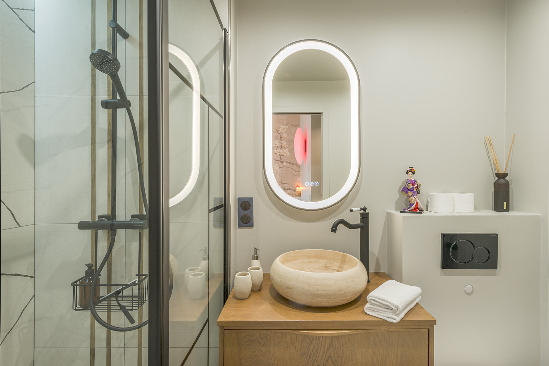 La salle de bains est un véritable sanctuaire de relaxation, avec ses matériaux naturels et son design japonais raffiné. La douche semble taillée dans la pierre et le bois, évoquant l’atmosphère d’un onsen traditionnel. Son miroir lumineux ajoute un côté moderne à cette expérience UNIQUE. La décoration japonaise dans la salle de bains ajoute, elle, une touche d’élégance et de tradition.