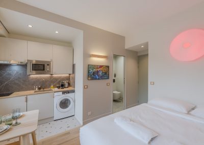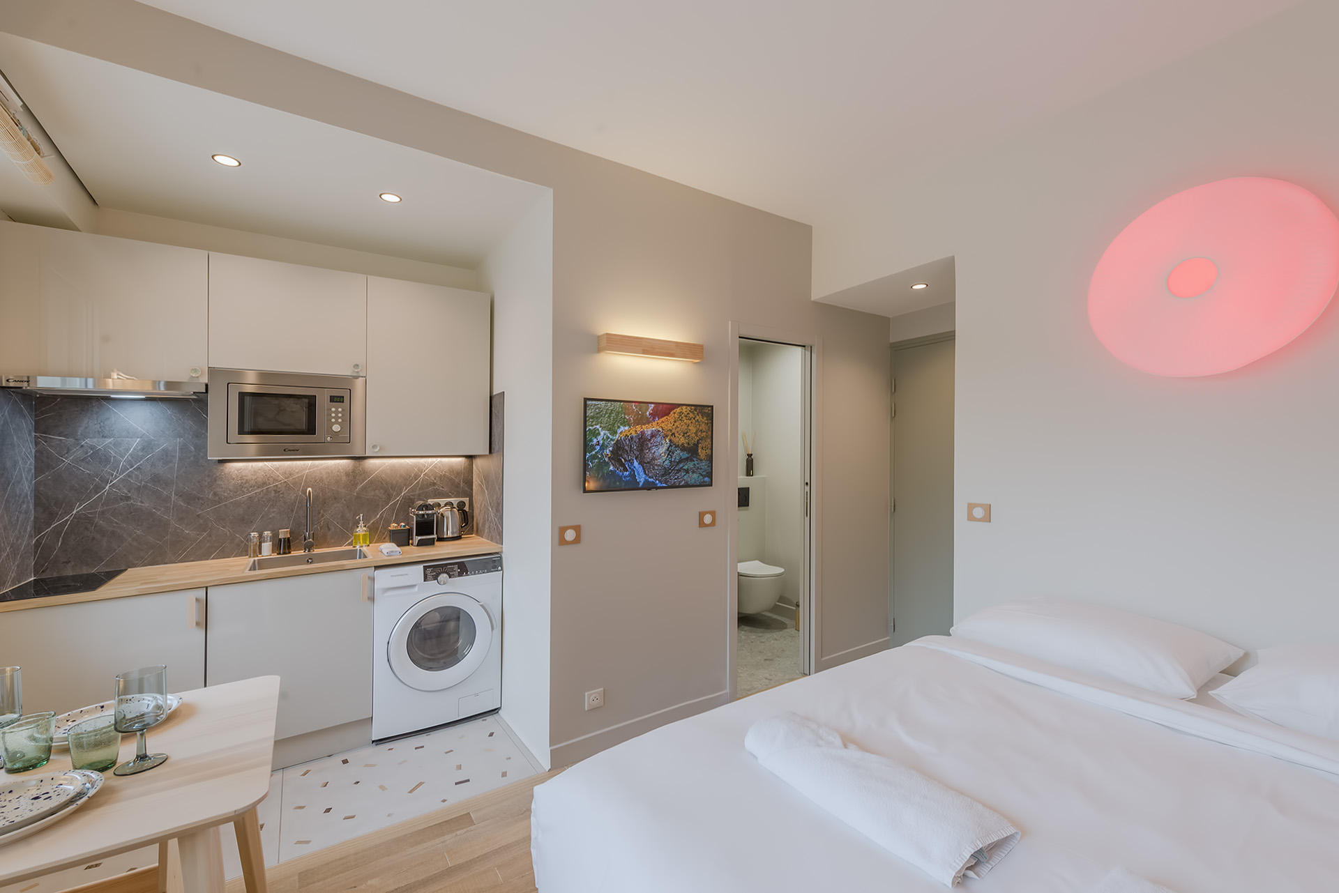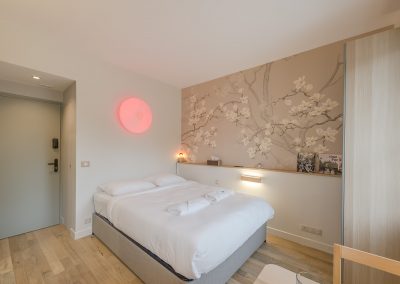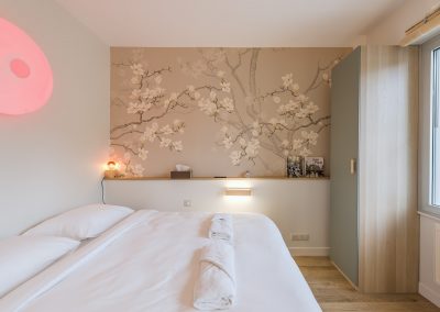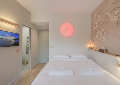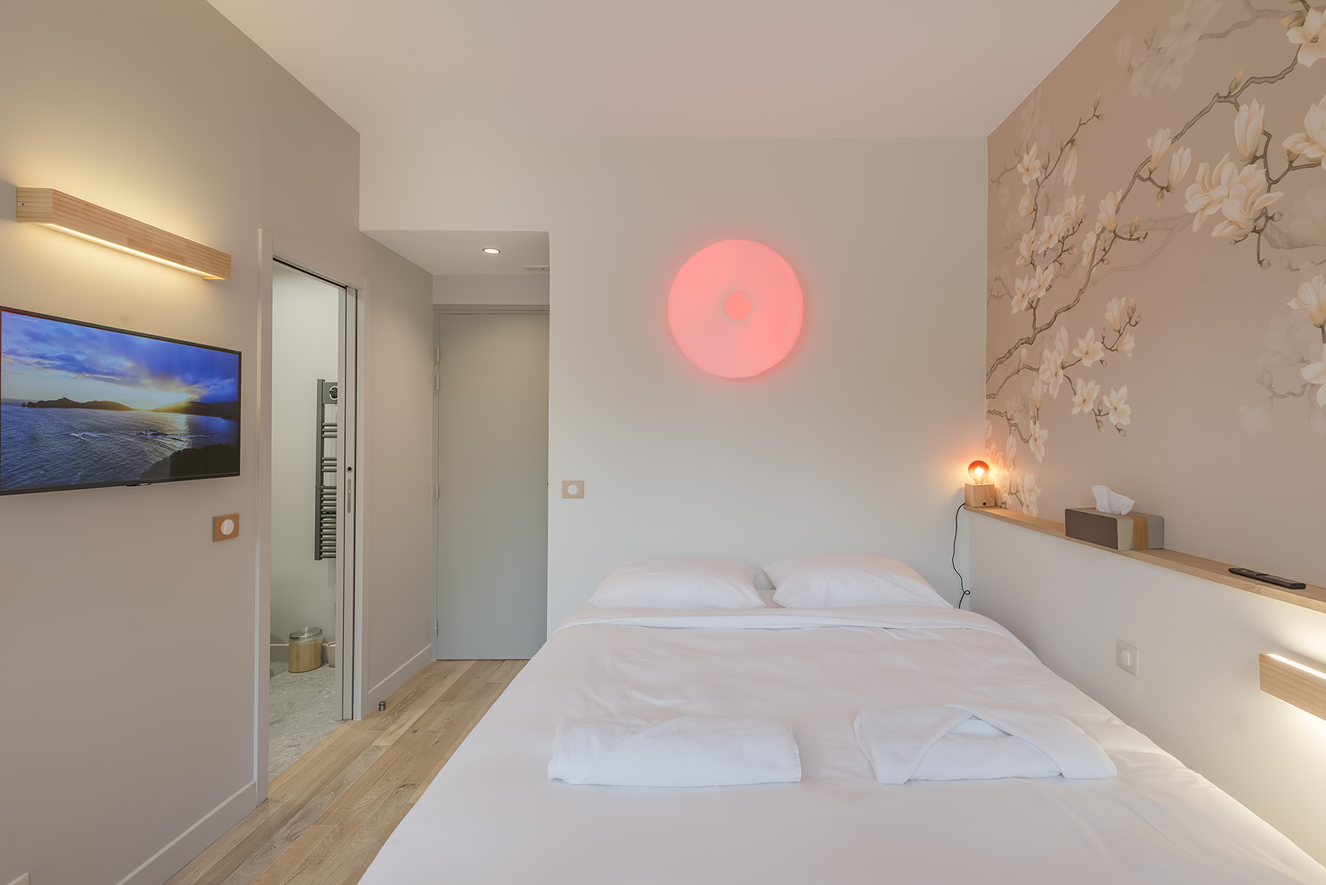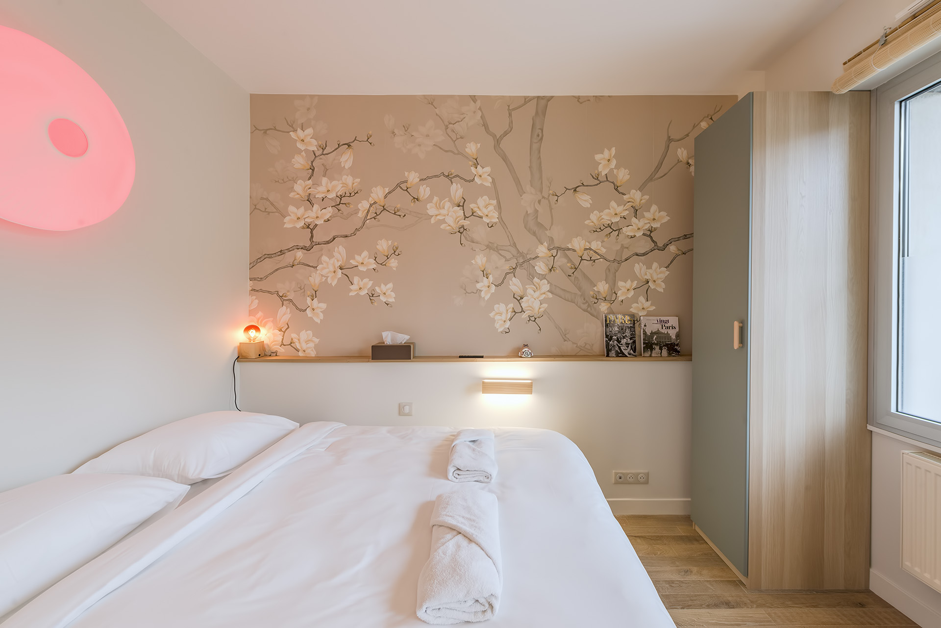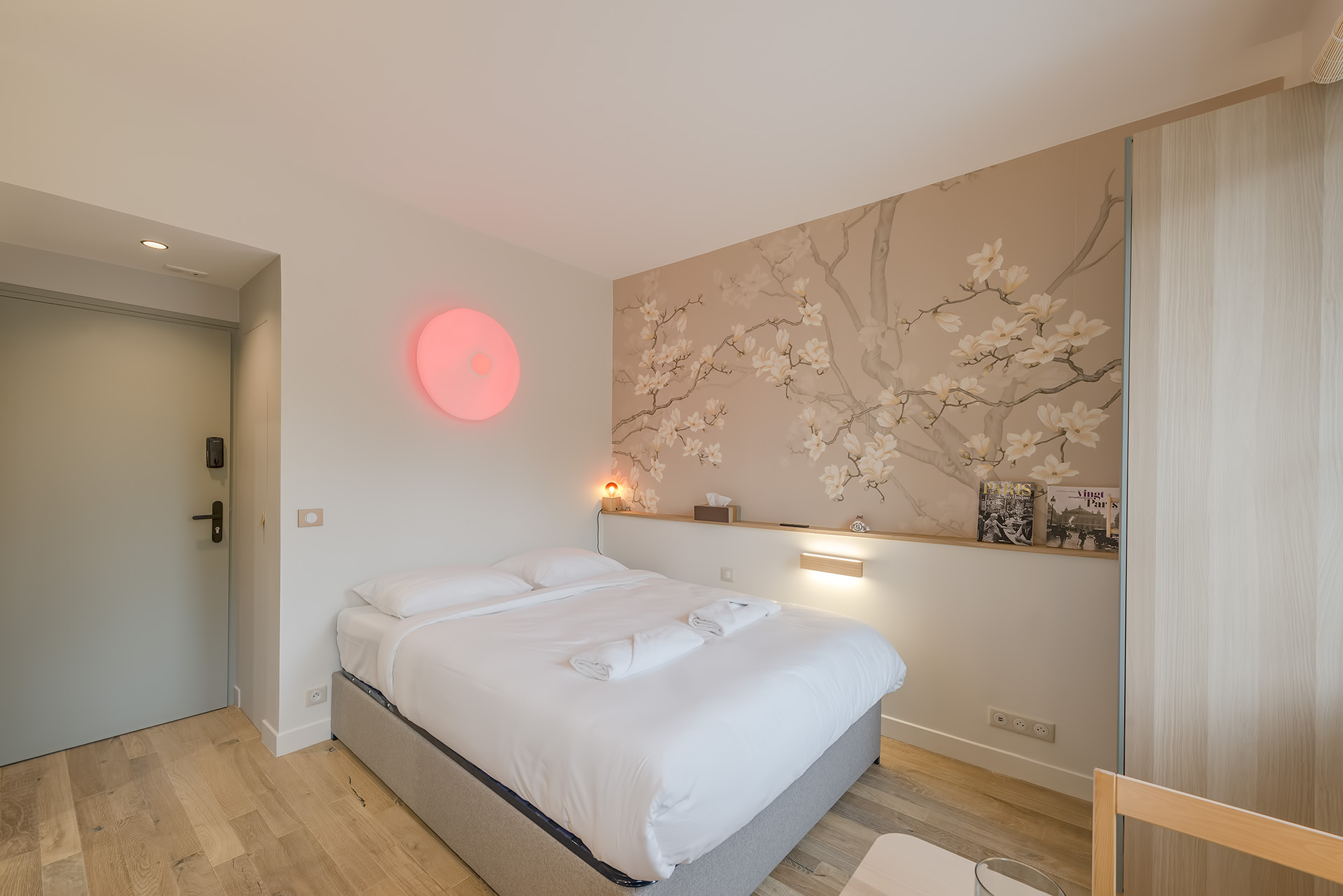 Dans l’espace de vie, une sublime tapisserie ornée de fleurs blanches sur fond beige trône au-dessus du lit Queen size. Les pétales délicats et les branches élégantes évoquent la sérénité des jardins japonais. À côté, une lumière rose tamisée éclaire doucement la pièce, rappelant le coucher de soleil. Cette teinte délicate crée une ambiance chaleureuse et apaisante, évoquant la douceur des soirées d’été à Osaka.