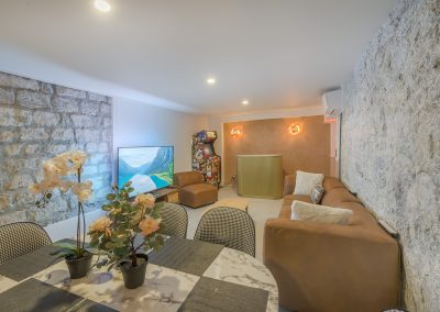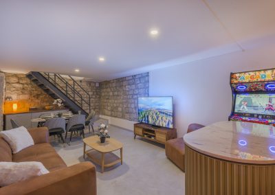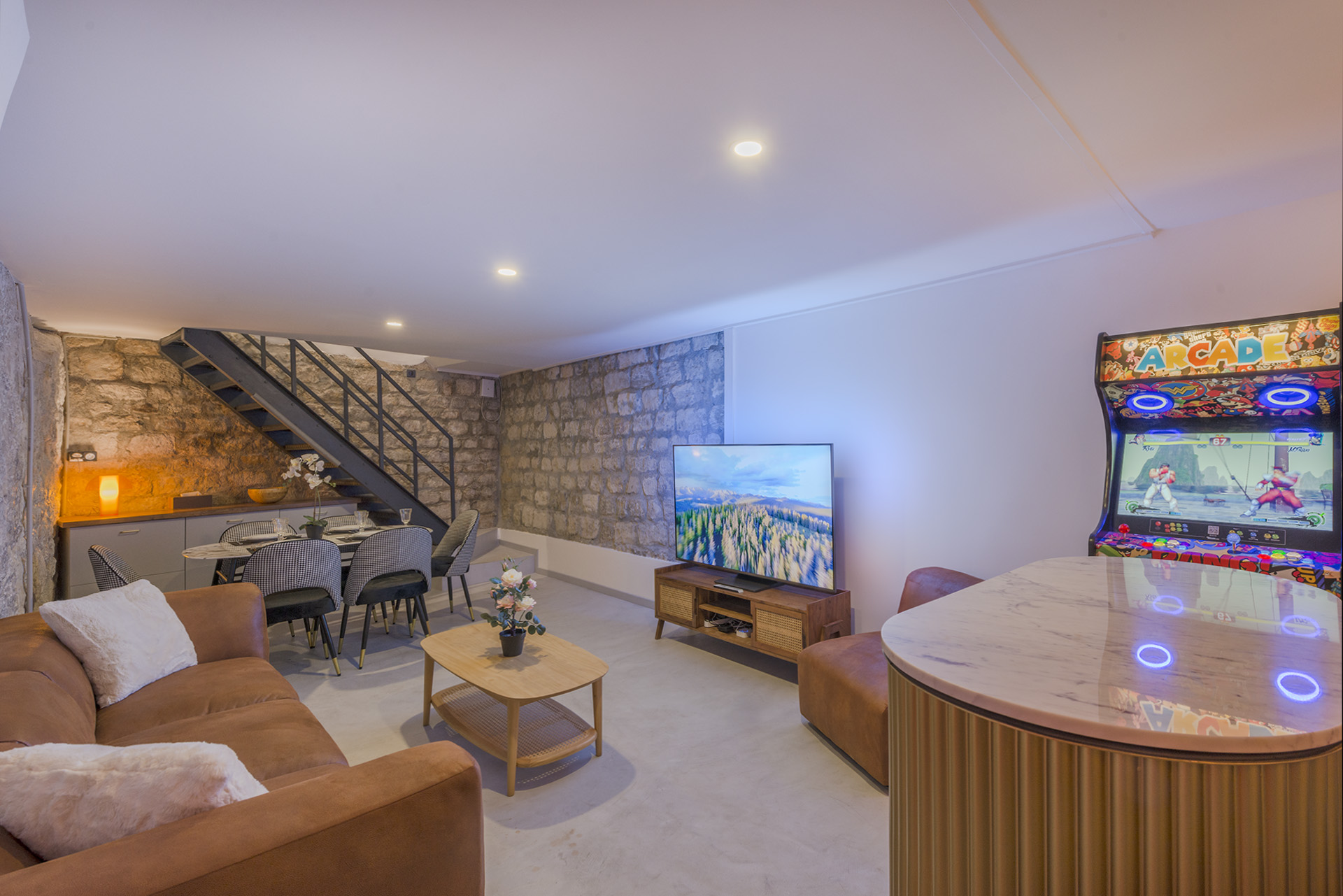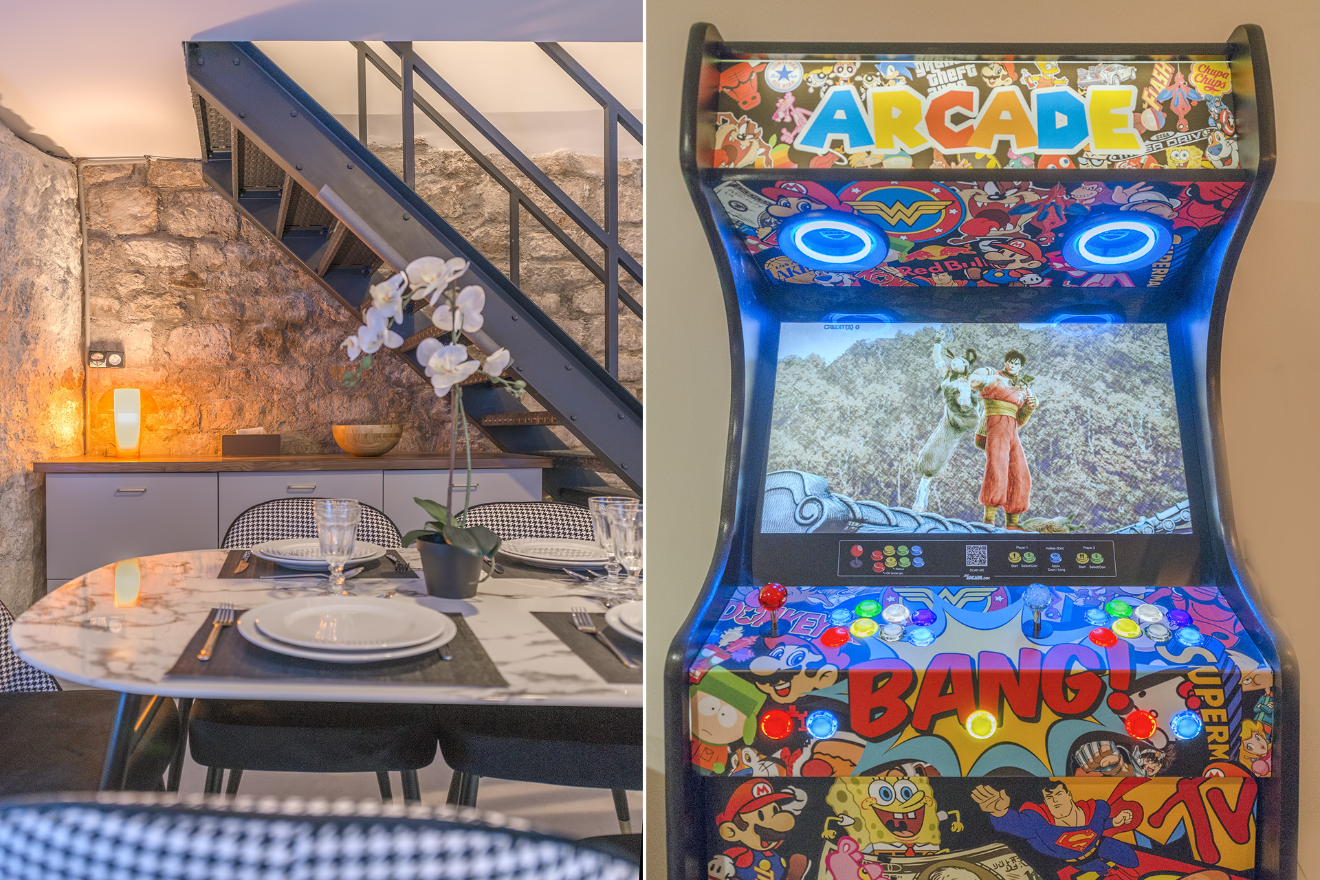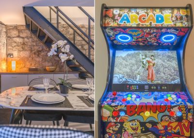 Mais vous vous interrogez ! Qu’est-ce qui nous attend au pied de l’escalier ? Vous descendez, vous appréciez le spectacle : une sublime salle de jeux, avec sa machine de jeux Arcade Unique en son genre, sa grande télé 4K, son mini bar et ses flûtes á champagne… tout est réuni pour vous faire passer d’incroyables moments en famille ou entre amis !