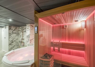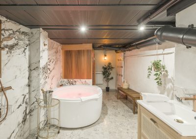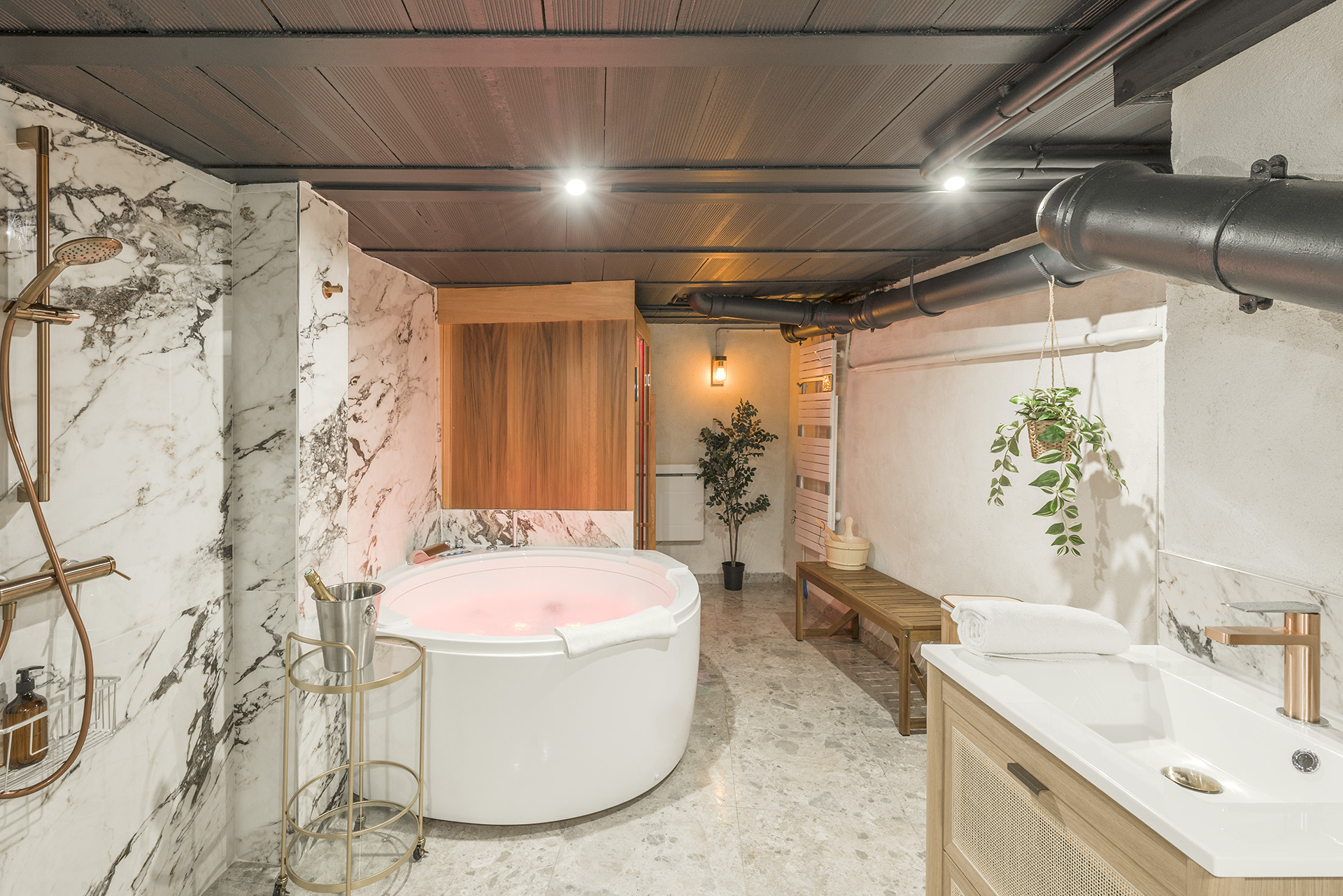Mais ce n’est pas tout… le clou du spectacle se situe dans la deuxième partie du sous-sol : traversez ce couloir hors du commun, couvert de part et d’autres par des tableaux et peintures faites main, vous mettant tout de suite dans l’ambiance parisienne. Entrez dans cette dernière pièce, à l’ambiance tamisée. Vous y trouverez une grande baignoire balneo pour vous relaxer avec un bon massage par les jets d’eau, accompagné, pourquoi pas, d’un bon verre de champagne. Vous y trouverez également un sauna, dans lequel vous pourrez enfin souffler et oublier tous vos soucis, avant d’aller vous blottir dans les bras de Morphée !